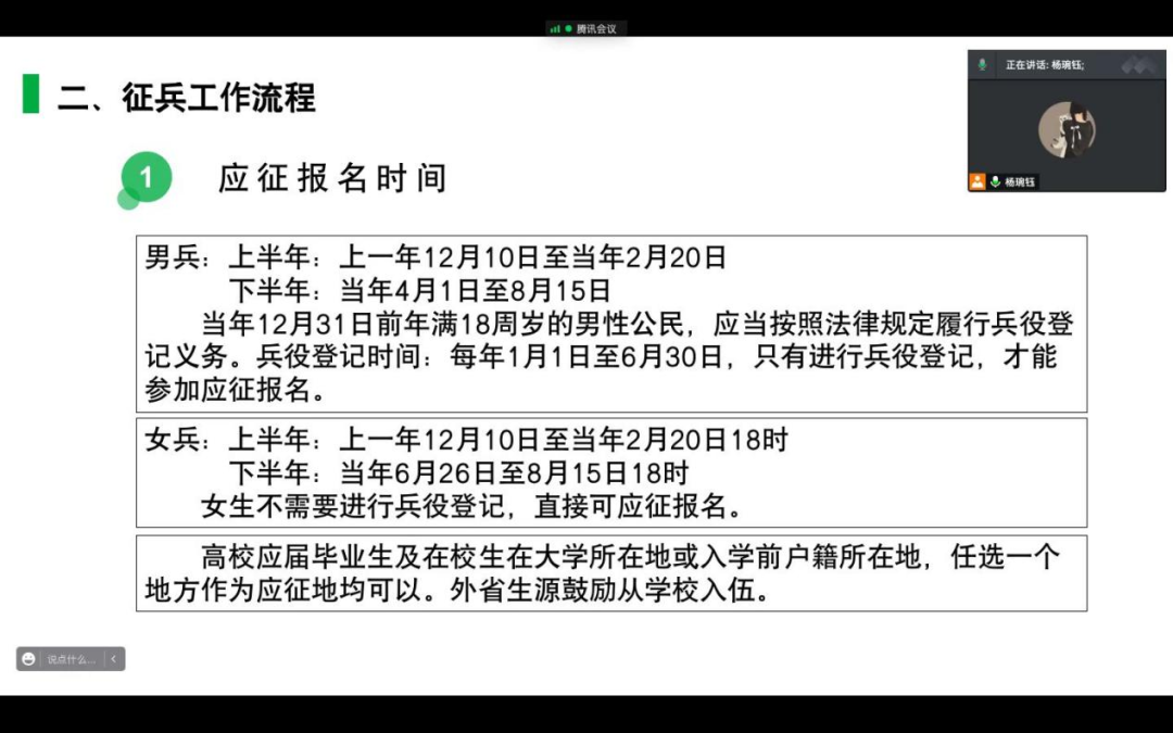 疫情蔓延无情,人心齐齐有力!为全力配合西安市疫情防控管理,一鼓作气打赢抗疫攻坚战。565net必赢于1月7日10:00在腾讯会议召开了线上退伍大学生抗疫事迹宣讲暨征兵动员大会。2021级本科生全体同学参会,会议由2021级本科生辅导员杨琬钰主持。
