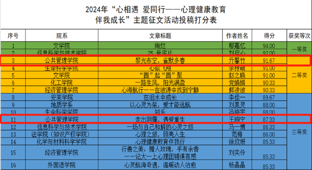 为贯彻落实学校《关于面向全校学生征集“心相遇 爱同行——心理健康教育伴我成长”主题征文的通知》要求,公管院全院学生积极参与“心相遇 爱同行——心理健康教育伴我成长”主题征文活动。征文经院系选拔后参与校内评比,我院亓馨竹同学凭借原创作品《黎光布空,雀默多春》荣获二等奖,我院王琬宁同学凭借原创作品《走出阴霾,遇爱重生》荣获三等奖。