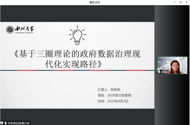 2020级行政管理专业硕士研究生张帆帆同学的汇报题目为《基于三圈理论的政府数据治理现代化实现路径》。首先,她介绍了政府数据治理现代化的现实背景和研究现状。其次,她对数据、政府数据治理、现代化等概念的内涵进行了解释,在此基础上将政府数据治理现代化理解为政府治理领域的一项战略。再次,介绍了公共部门战略管理的三圈理论框架,分析了其与政府数据治理现代化的契合性,基于改框架,从价值、能力、支持三个层面构建了政府数据治理现代化模型。最后,围绕着上述模型,从明确价值取向、提高数据治理能力、加大对数据治理的支持力度等方面提出了政府数据治理现代化的实现路径。