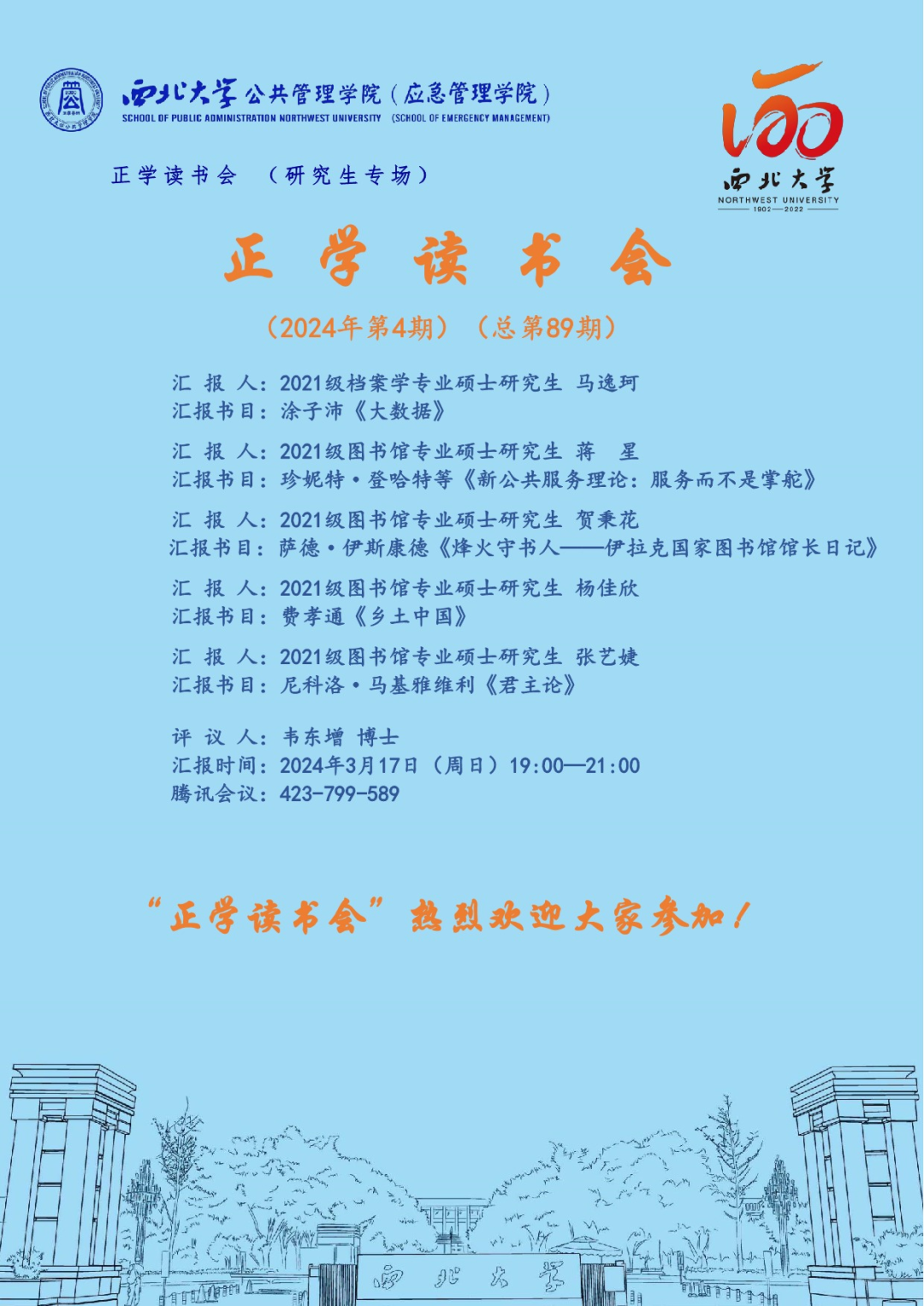 2024年3月17日,我院线上举办了2024年第4期正学读书会。西北大学565net必赢2021级档案学专业硕士研究生马逸珂、2021级图书馆专业硕士研究生蒋星、2021级图书馆专业硕士研究生贺秉花、2021级图书馆专业硕士研究生杨佳欣、2021级图书馆专业硕士研究生张艺婕分别作为主讲人进行读书汇报,2023级公共管理专业韦东增博士担任评议人,部分研究生旁听了此次会议。