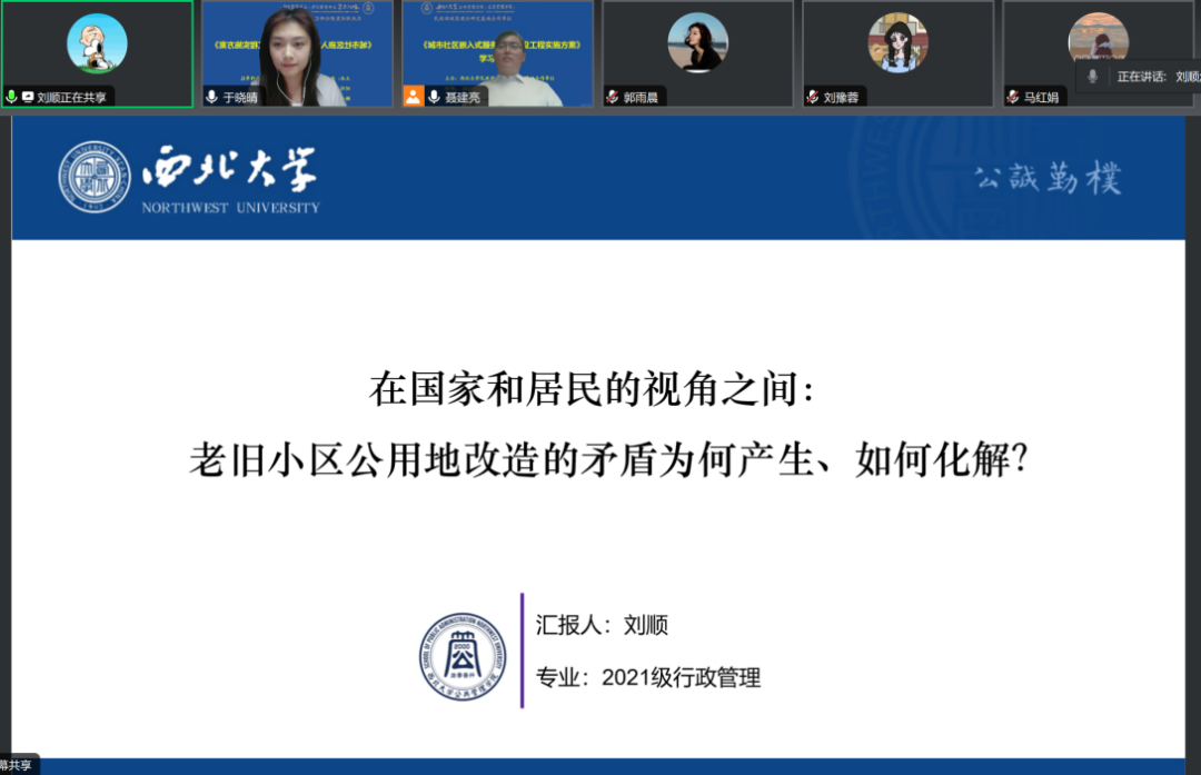 基地硕士生刘顺汇报的题目是《在国家和居民的视角之间:老旧小区公用地改造的矛盾为何产生、如何化解?》。刘顺从一个老旧小区改造的案例引入,分析了老旧小区公用地改造的矛盾如何产生以及如何化解的问题。她认为之所以会产生矛盾,是因为基于国家的视角形成的公用地改造方案未能很好地回应居民的需求,并提出在改造前,需求调查与共识达成必不可少,应该让改造的节奏“慢下来”。