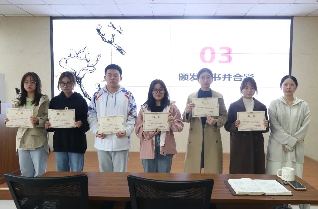 杨琬钰老师为主任团成员颁发聘书,全媒体中心主任陈婷婷为各组负责人颁发聘书,并一同合影留念。