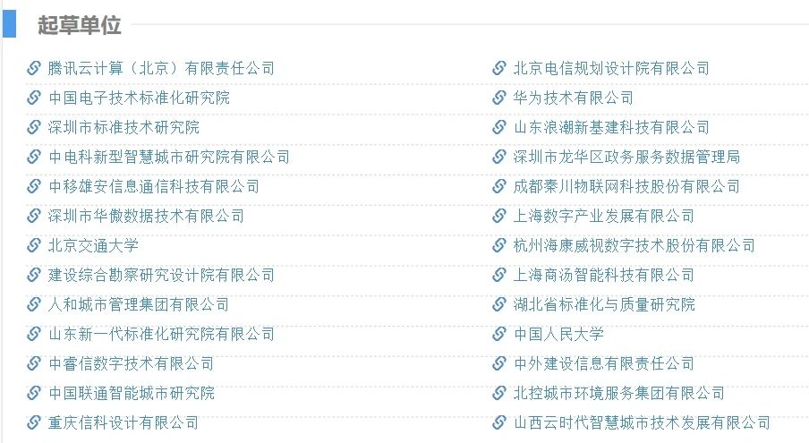 主要起草单位 腾讯云计算(北京)有限责任公司 、北京电信规划设计院有限公司 、中国电子技术标准化研究院 、华为技术有限公司 、深圳市标准技术研究院 、山东浪潮新基建科技有限公司 、中电科新型智慧城市研究院有限公司 、深圳市龙华区政务服务数据管理局 、中移雄安信息通信科技有限公司 、成都秦川物联网科技股份有限公司 、深圳市华傲数据技术有限公司 、上海数字产业发展有限公司 、北京交通大学 、杭州海康威视数字技术股份有限公司 、建设综合勘察研究设计院有限公司 、上海商汤智能科技有限公司 、人和城市管理集团有限公司 、湖北省标准化与质量研究院 、山东新一代标准化研究院有限公司 、中国人民大学 、中睿信数字技术有限公司 、中外建设信息有限责任公司 、中国联通智能城市研究院 、北控城市环境服务集团有限公司 、重庆信科设计有限公司 、山西云时代智慧城市技术发展有限公司 。
