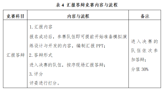 将环节2理论知识、环节3模拟演练实战成绩汇总后排名,选取一定比例队伍进入决赛,参加汇报答辩。未进入决赛答辩的队伍可现场观摩学习。