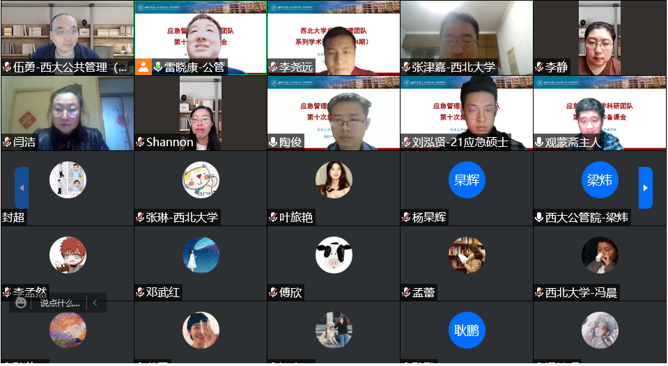 接着,雷晓康教授提到,此次来势汹汹的新冠肺炎疫情让我们认识到应急预案的重要性,因此我们更应该发挥西北大学应急管理学院的优势,总结西安防疫工作中的不足,提炼有关经验向社会推广。随后,团队师生就雷晓康教授提出的观点进行了交流互动。最后,雷晓康教授作总结发言。他鼓励团队成员一方面向前看,对本轮疫情进行前瞻性思考,在沉浸式感受中进一步为西安新冠疫情应急处置建言献策;另一方面向后看,充分发挥团队成员在本轮疫情中的感知体验,积极总结西安疫情防控的经验得失,为其它地区提供参考。